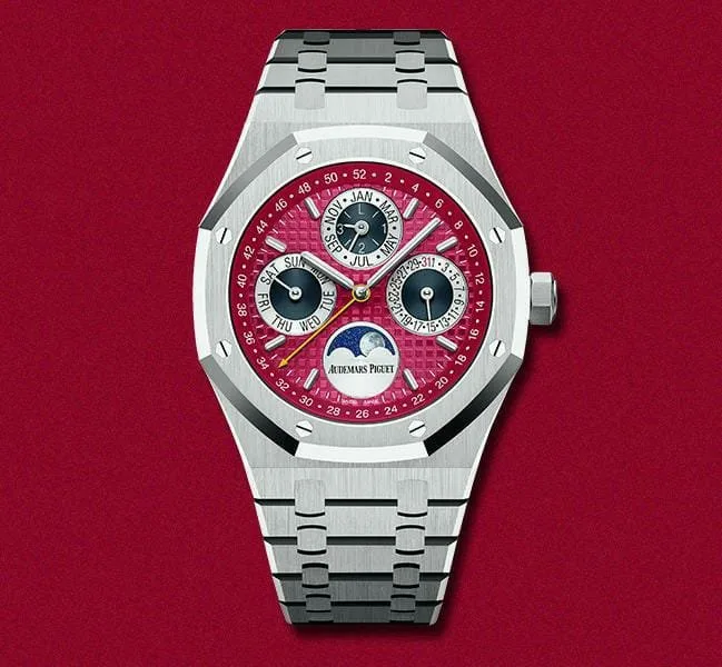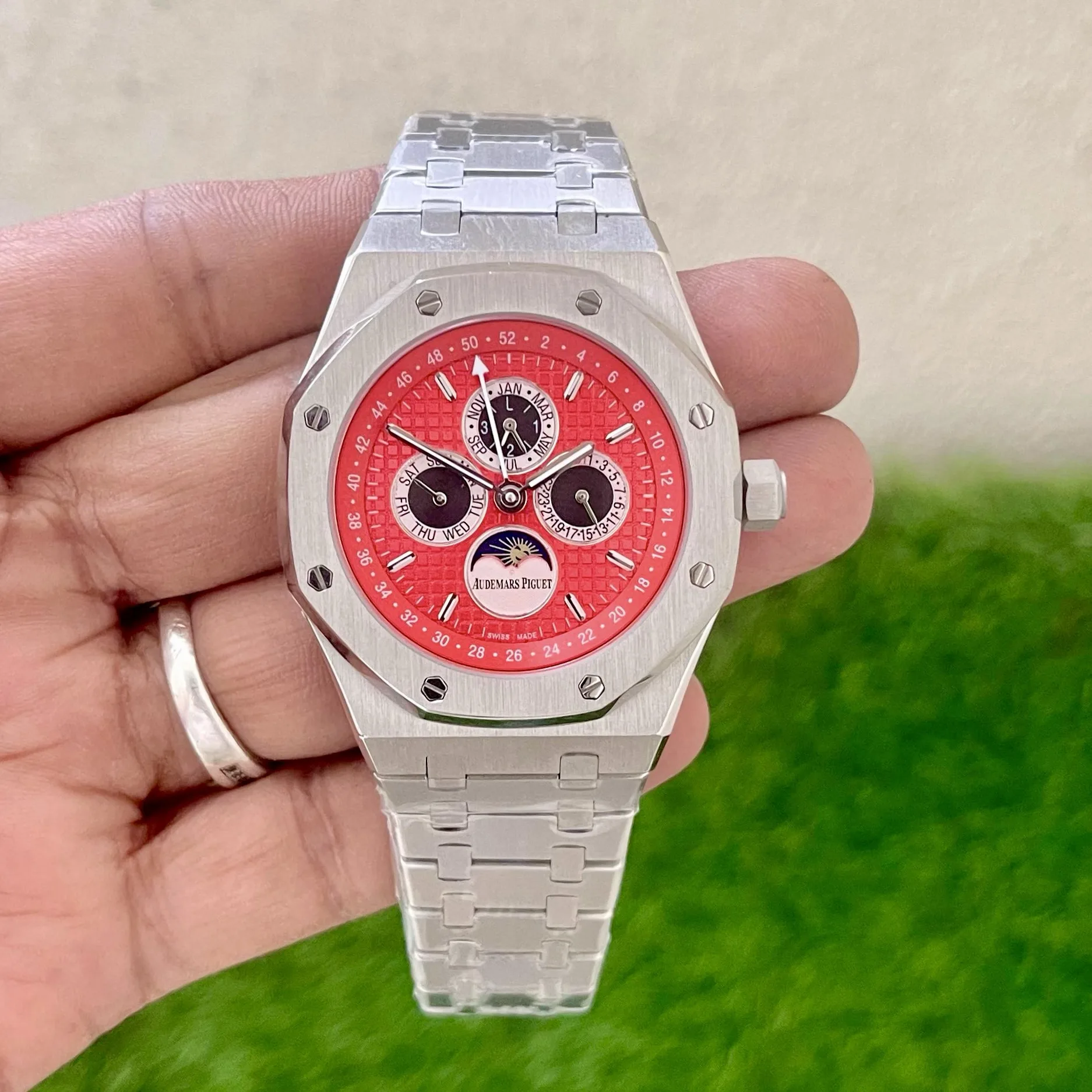 👉Stainless-steel slate-steel case and chain, Anti-reflective scratch resistant sapphire glass on a Red dial with “Grande Tapisserie” pattern, luminous indices and hands, fastened by original AP lock.