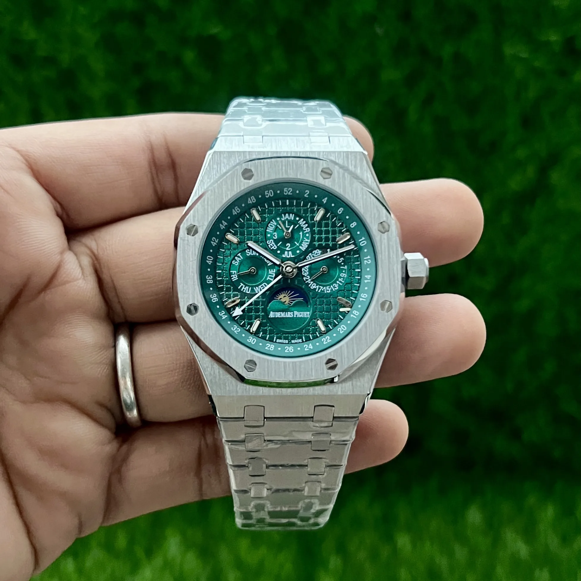 This model isn’t just about timekeeping—it’s a bold style statement. The open-worked green dial, anniversary edition detailing, and mechanical craftsmanship make this Royal Oak Perpetual Calendar a top-tier choice for serious collectors and style-forward gentlemen.