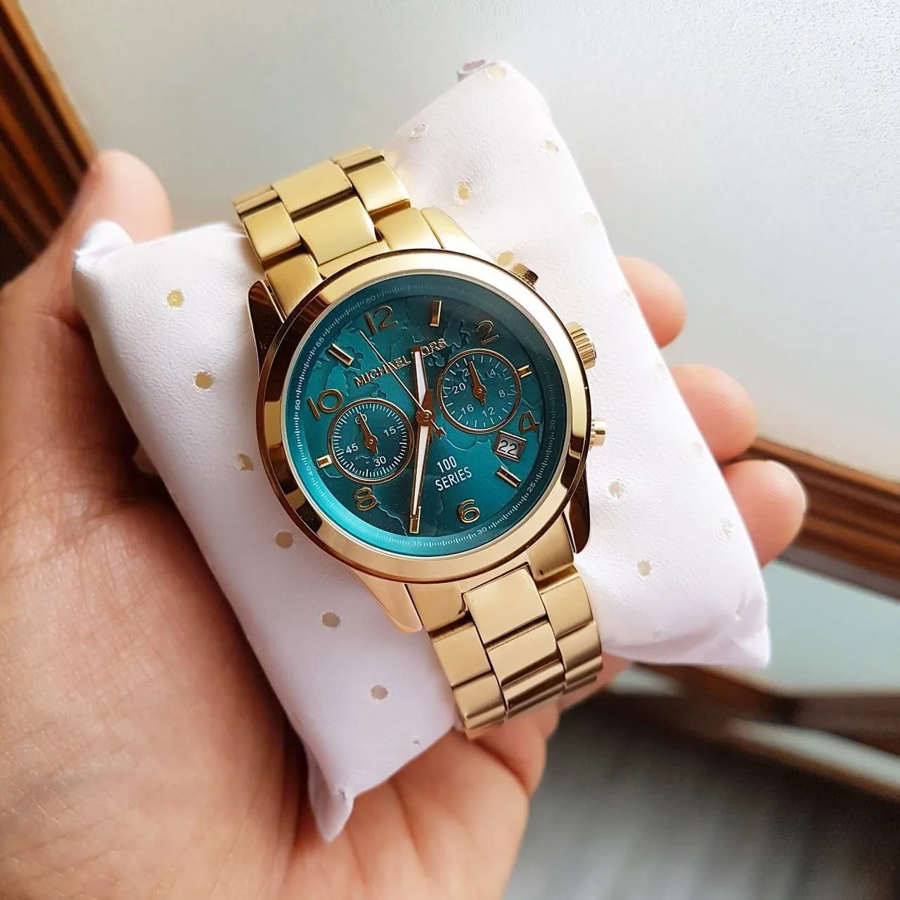 - Stylish world-map etched green dial