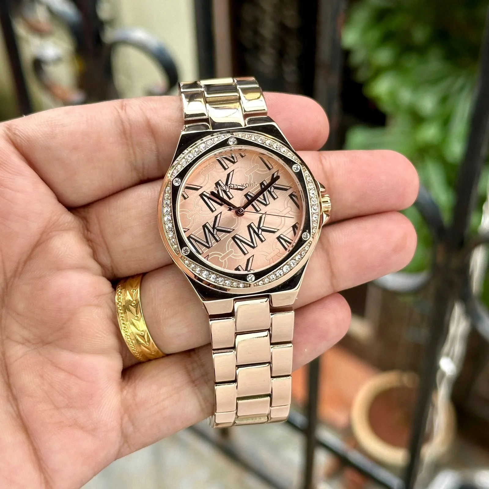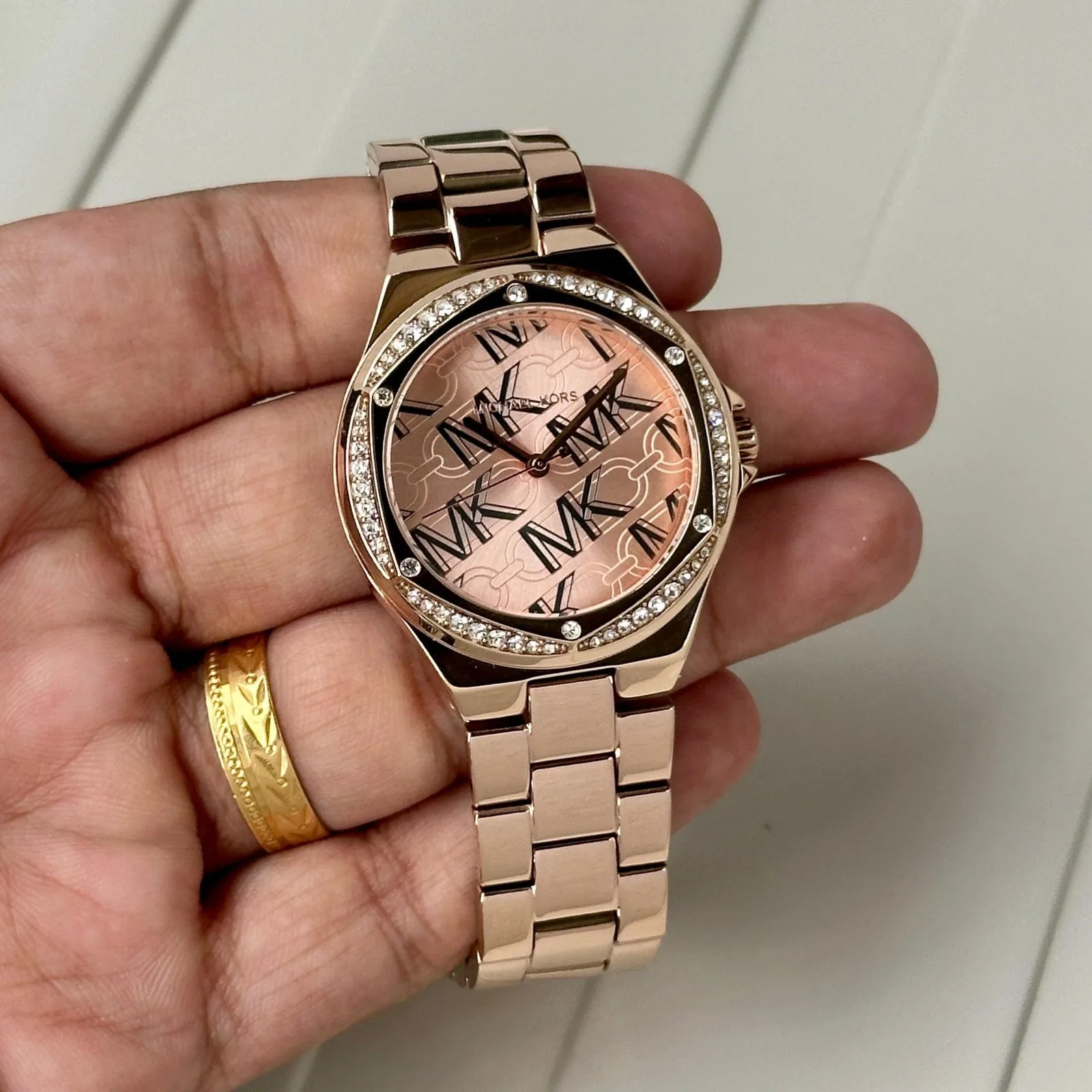 *Michael Kors’ 37mm Lennox watch features a rose gold MK logo dial, three-hand movement, rose gold-tone stainless steel bracelet and a pavé topring.✅*