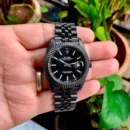Date Indicator. Stainless Steel Black bezel and & Matte Black Case, Sapphire glass On A Black dial with Luminous indices and hands, fastened by Stainless Steel Five Link Black Jubilee chain with original Rolex Clasp lock.
