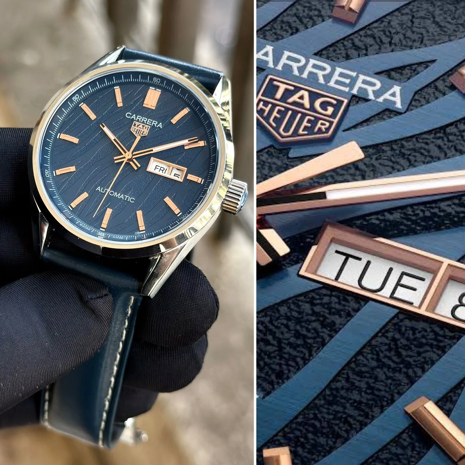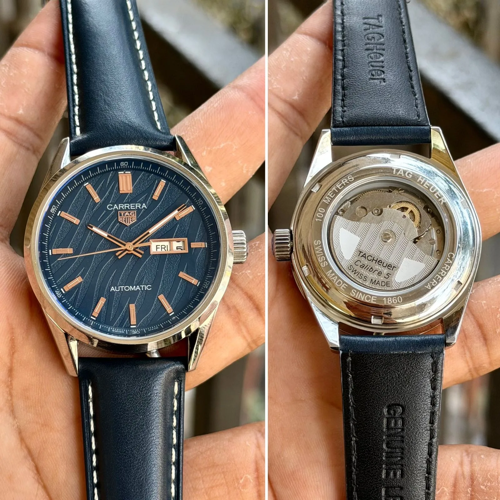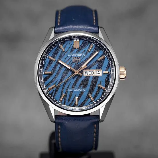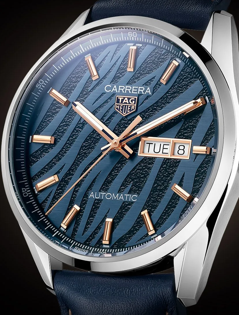 The bold blue dial featuring tiger-inspired detailing gives this Carrera a distinctive personality, while the stainless steel case ensures durability and a refined finish. The sapphire crystal provides excellent scratch resistance, and the open caseback offers a clear view of the automatic movement in action.