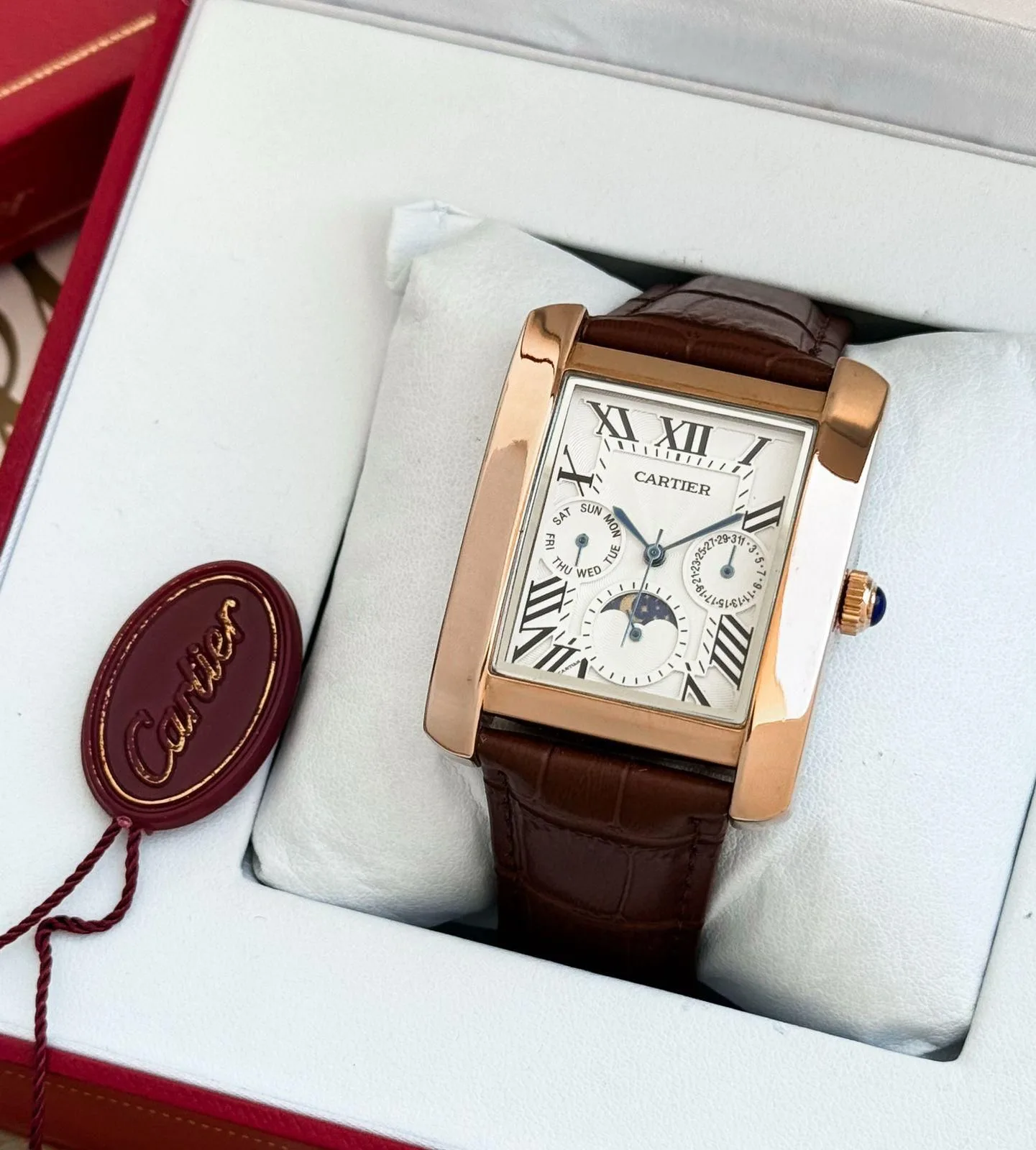 The solid stainless steel back is finished with brand detailing, while the original Cartier-style lock ensures a secure and polished wear. Built with a durable, battery-operated mechanism, this watch is made for everyday reliability.
