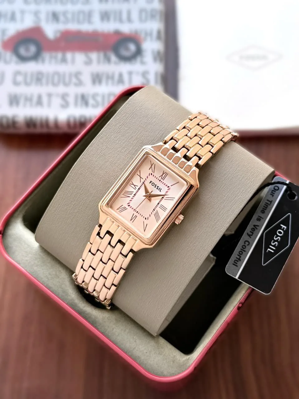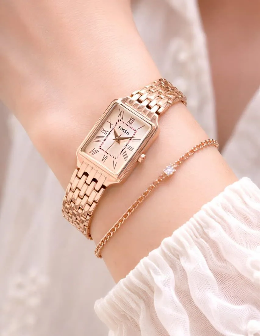 The Fossil Raquel is a refined statement piece designed for women who appreciate timeless silhouettes with a modern touch. Its sleek rectangular design and soft pink dial make it the perfect accessory to elevate both everyday style and special occasions.