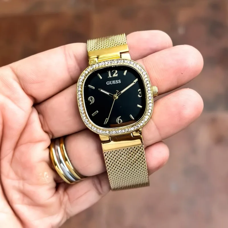 A bold new arrival designed to elevate your everyday style. This Guess women’s watch pairs a striking black dial with a polished golden strap, creating a refined contrast that works beautifully for both casual outings and evening wear.