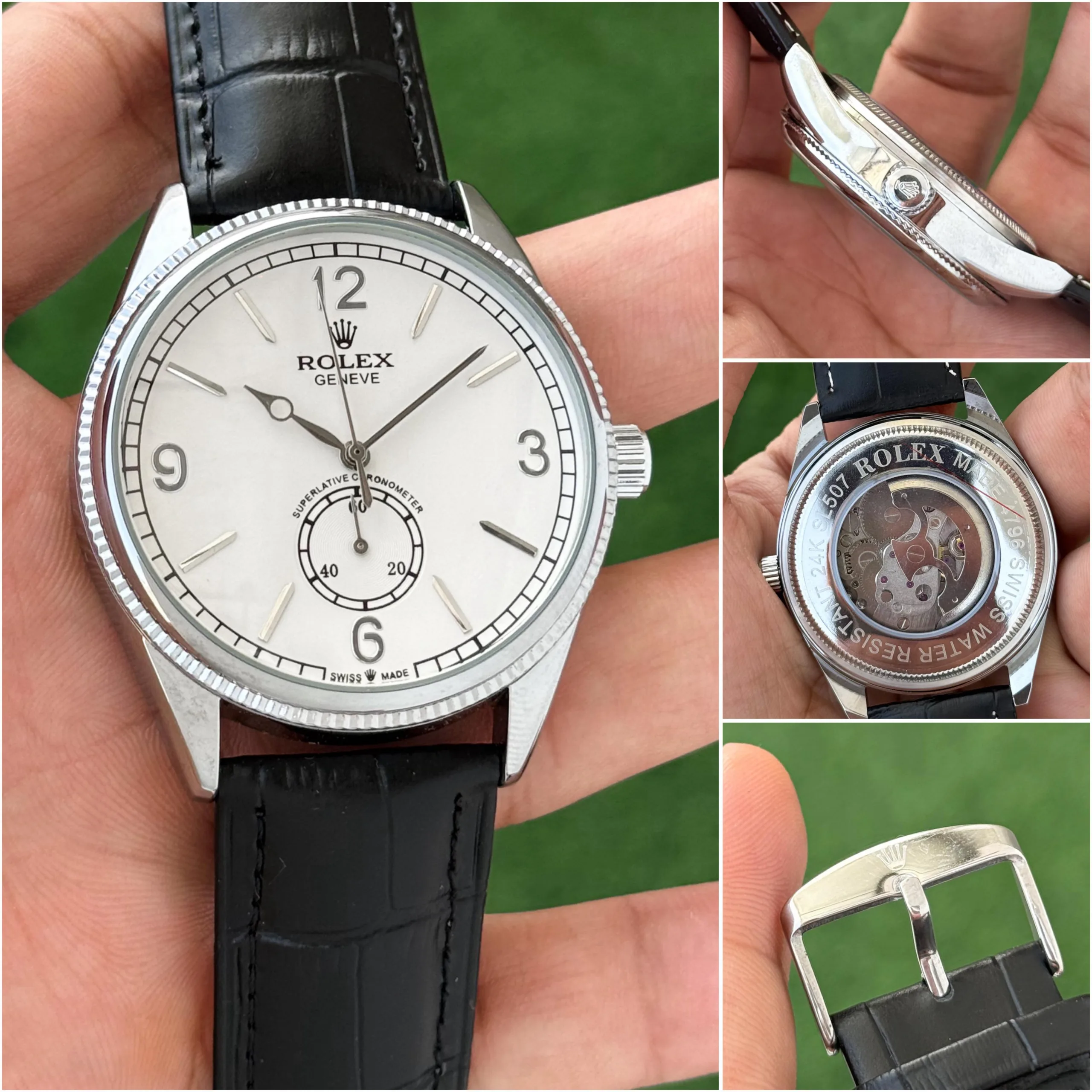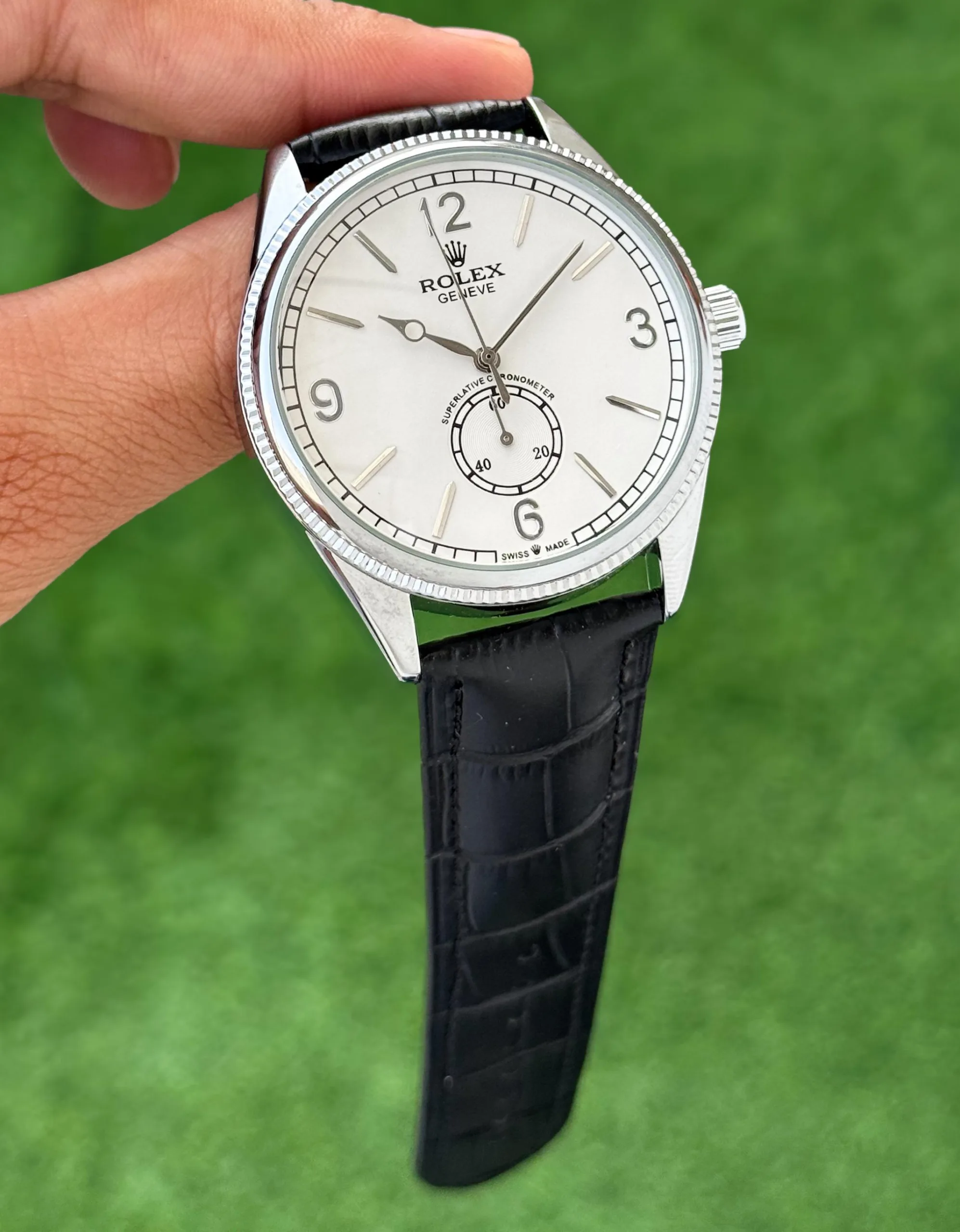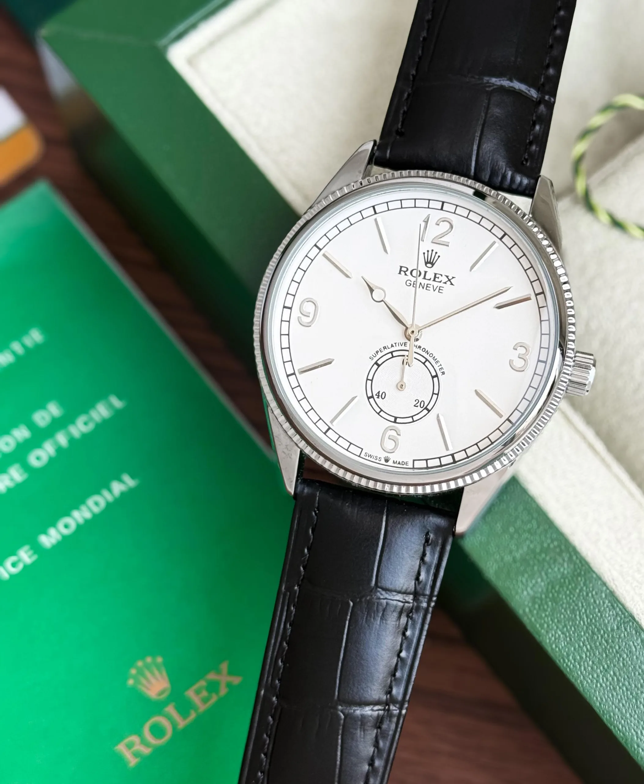Rolex Geneve Men’s Watch – 43mm | White Dial | Black Leather Strap