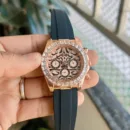 The striking tiger-pattern dial adds a fierce and distinctive character, perfectly complemented by the multicolor rainbow-style bezel that enhances its premium appeal. Encased in a polished rose gold stainless steel body, the watch offers both durability and a luxurious finish.