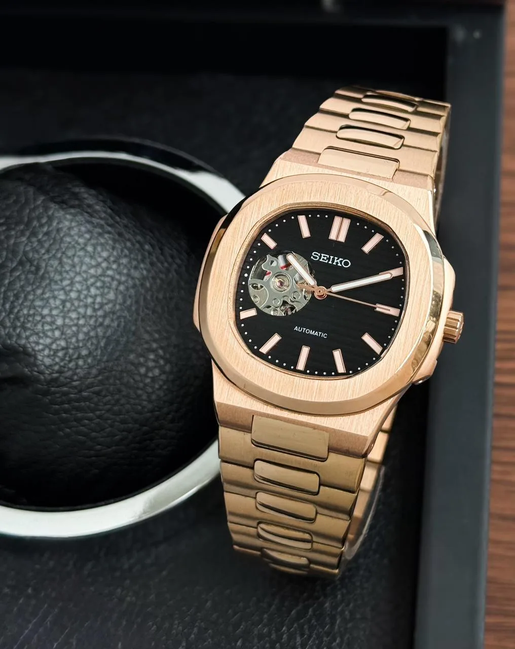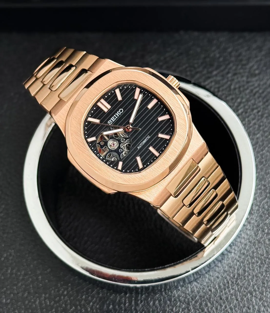 Inspired by the iconic Nautilus design, this Seiko automatic timepiece blends sporty elegance with timeless luxury. Featuring the signature rounded octagonal bezel and horizontally textured dial, it delivers a bold yet refined look that stands out on any wrist.
