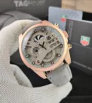The matte-finish body enhances its sporty appeal, paired with a comfortable and adjustable grey leather strap for a secure fit. Designed with a signature clasp buckle and a unique rotating seconds detail, this watch makes a strong statement on the wrist.