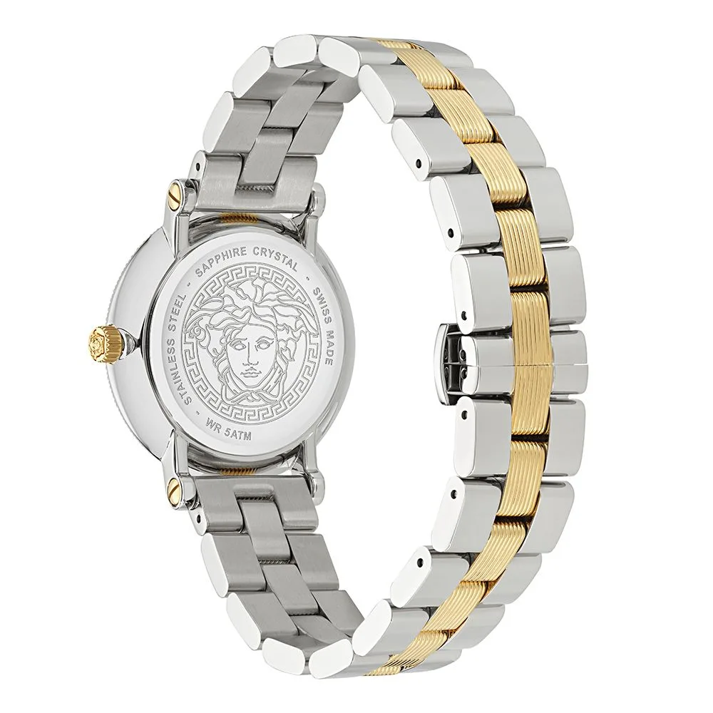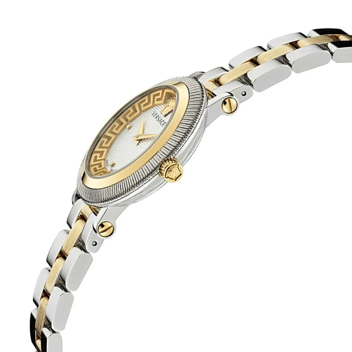 The watch features a beautifully textured silver dial, highlighted by the legendary Medusa head at the 12 o’clock position — a true symbol of Versace heritage. Encircling the dial is the signature Greca pattern, adding a distinctive and luxurious touch to its design.